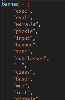 We are given a pyjail where our payload is run against an exec() call with no length restrictions, and a simple blacklist is also implemented.