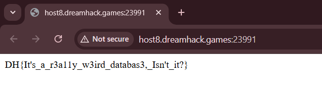 print(res.text)Flag: DH{It's_a_r3a11y_w3ird_databas3,_Isn't_it?}