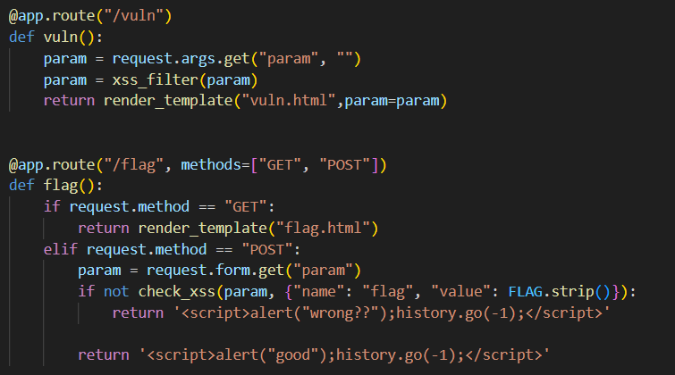We are given a webpage that has a /vuln endpoint with an XSS vulnerability, as well as a /flag endpoint that will visit the vulnerable endpoint with a headless browser.