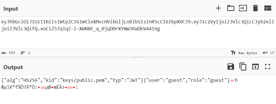 Decoding the JWT token from Base64 shows a kid parameter in the token header containing the path to a public key.