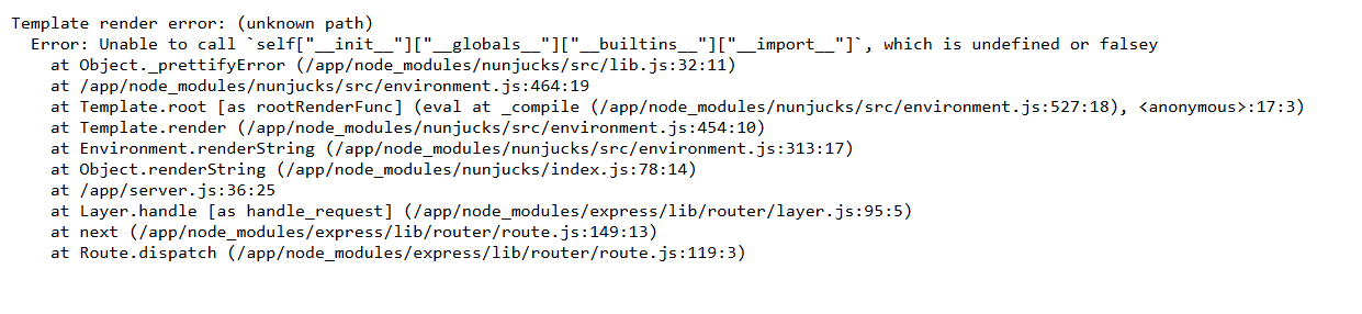 Running a simple Python SSTI payload shown below gave an error, which revealed that the server used Node.js Nunjucks for templating rather than Jinja.