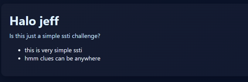 The greeting message hints that there is an SSTI vulnerability within the webpage.
