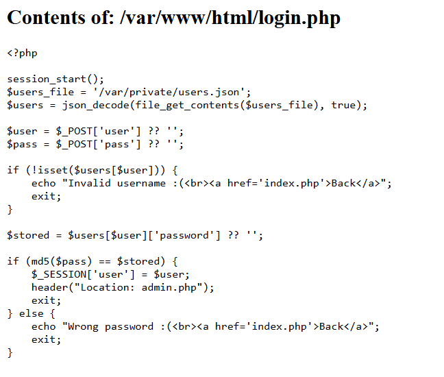 Viewing the source code for login.php also reveals the exact location of users.json.