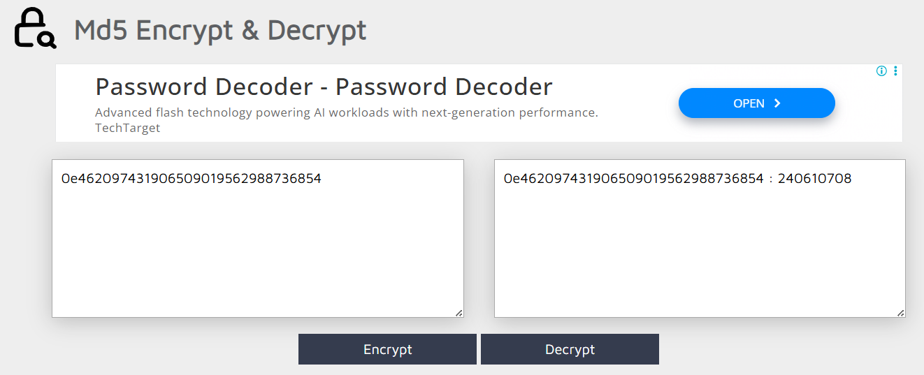 However, we can simply get the preimage of the MD5 hash using md5decrypt.