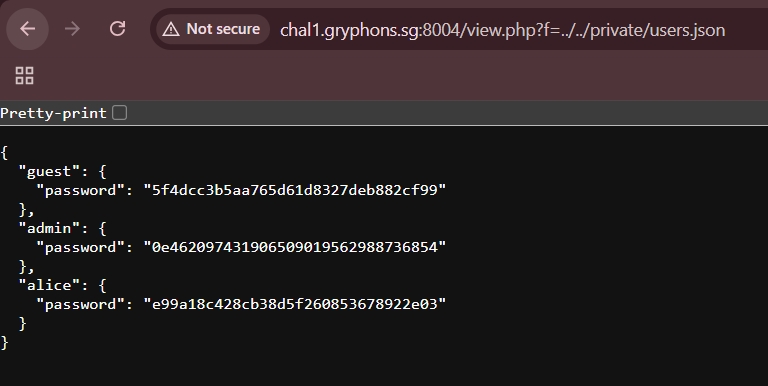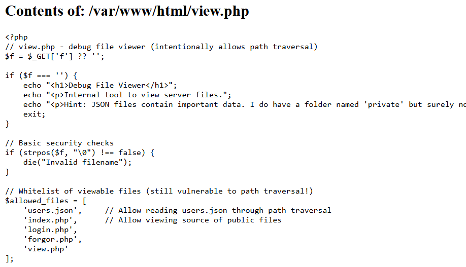 That indeed works, and we are able to view the source code of view.php. From this, we learn that there is a whitelist of readable files, and users.json is indeed among them.