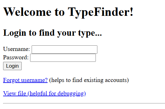 We also have a file viewer page, which hints that there is a list of accounts on the server, but there's no instructions on how to use it. However, judging from the fact that forgor.php uses q for arguments, a reasonable guess would be that view.php uses f for file arguments.